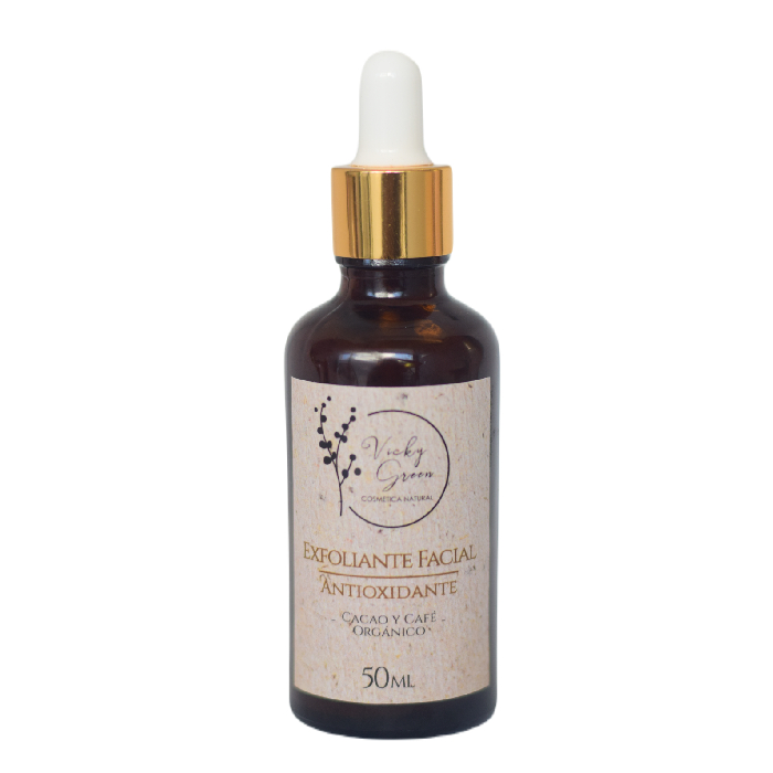 Renueva tu piel con el Exfoliante Facial Antioxidante de Vicky Green Cosmética. Con finas partículas exfoliantes de café y cacao orgánicos, esta fórmula en gel limpia en profundidad, aportando luminosidad y suavidad. Envase tipo gotero de vidrio, 50ml.