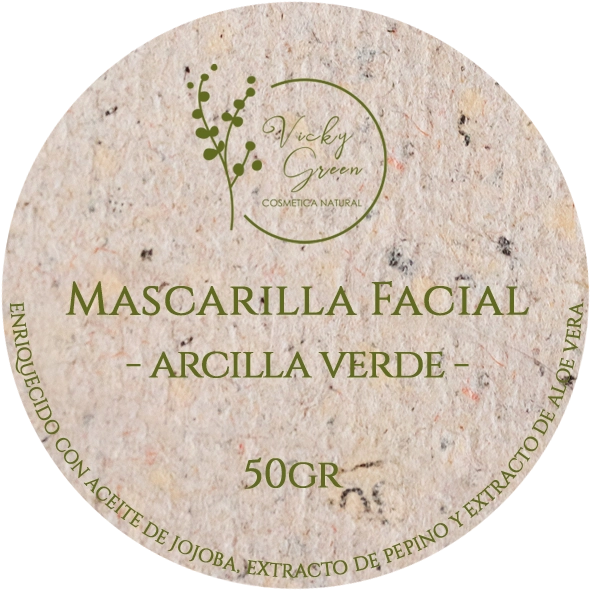 Mascarilla Facial de Arcilla Verde de Vicky Green, enriquecida con Aceite de Jojoba, Extracto de Pepino y Aloe Vera. Una fórmula ideal para purificar, equilibrar y revitalizar tu piel. Perfecta para todo tipo de piel. Envase 50gr